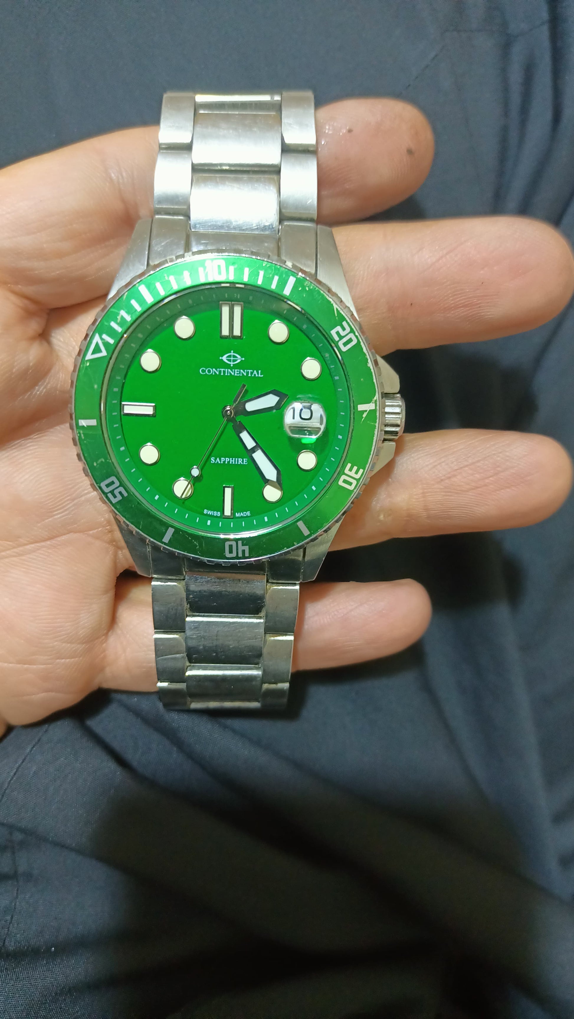 This sleek Continental watch is a total stunner! With its bold green 42 mm dial and matching rotating bezel, it's like a pop of freshness on your wrist. The stainless steel band gives it a solid, premium vibe, and the sapphire crystal adds that extra touch of durability. Plus, being Swiss Made adds a trust of quality that says all about the craftsmanship!