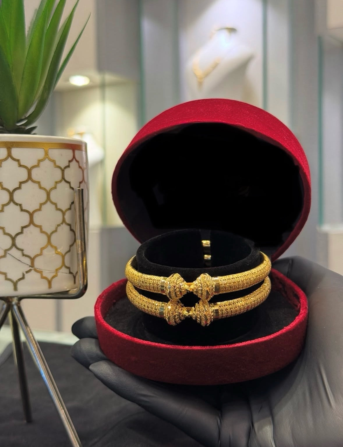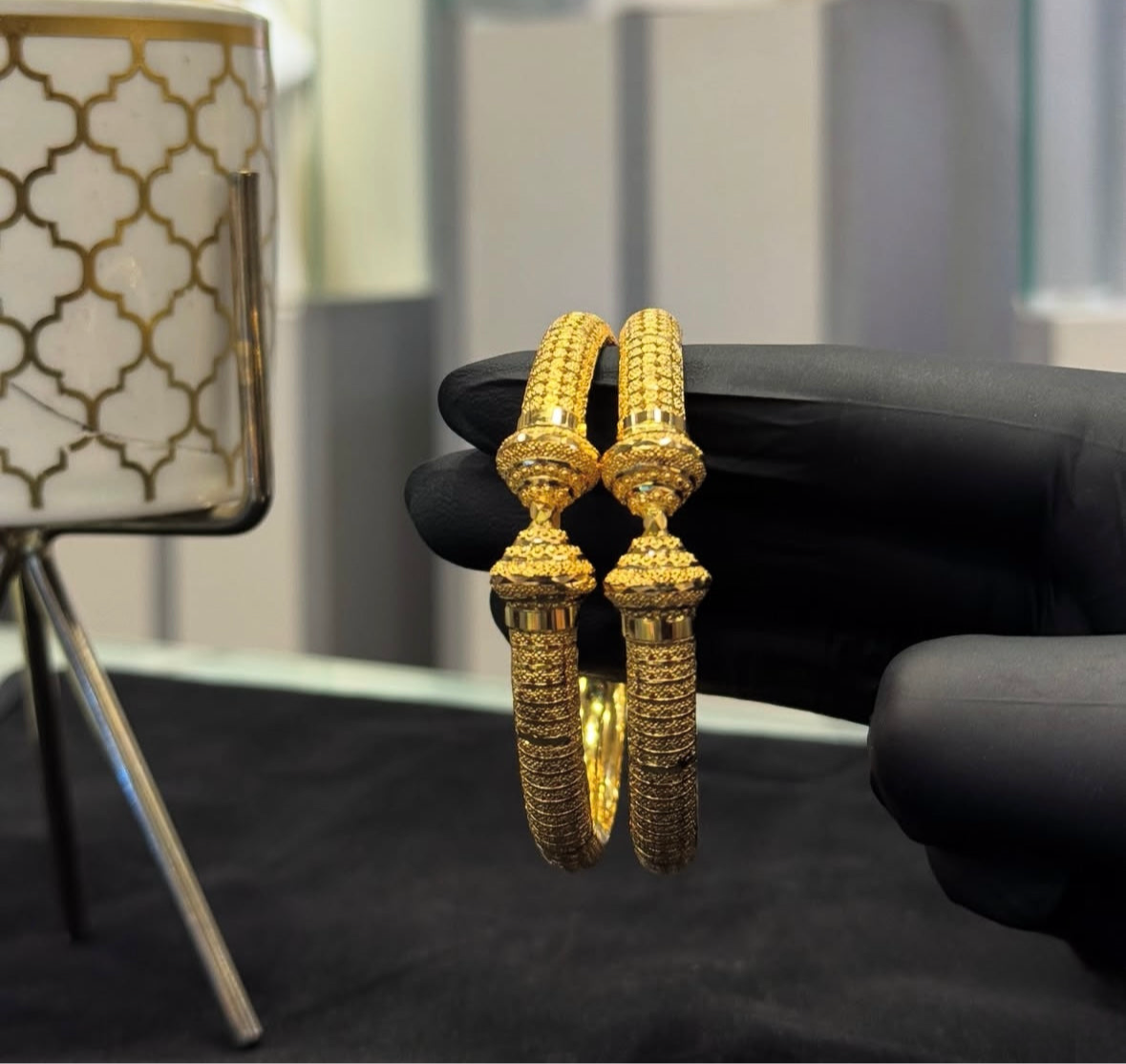 These casting Dome shape Bangles are stunning! They're gold with an intricate, textured design that adds a touch of elegance. The bangles have a distinctive dome shape at the top which transitions into a tapered cylindrical design. The detailed texture gives them a sophisticated, traditional look that's perfect for special occasions or everyday wear with a touch of glamour.
