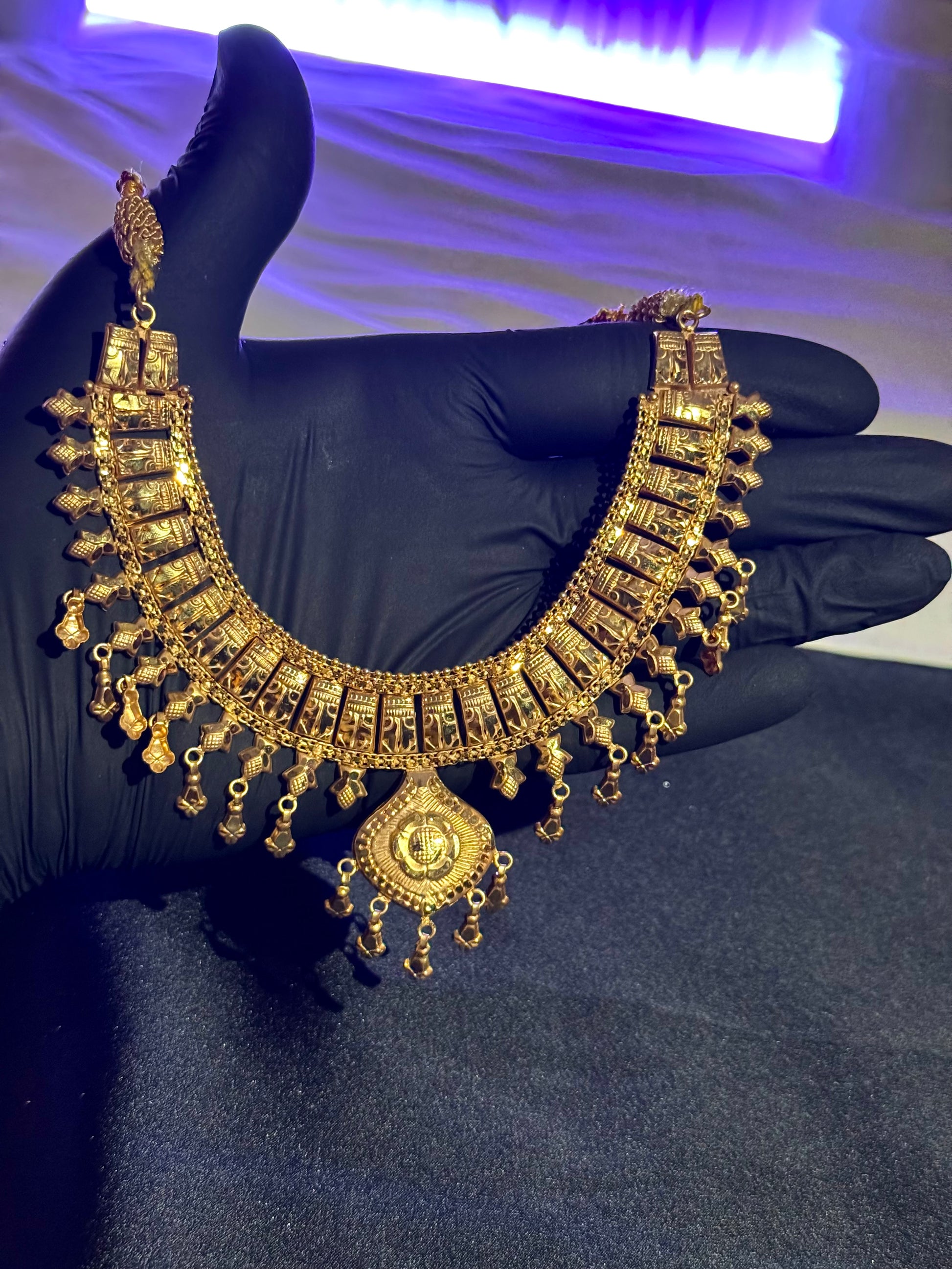 This stunning Gold plated Gaani set is a true showstopper! It features a breathtaking gaani (necklace) with intricate designs and delicate dangling charms that catch the light with every movement. The gaani's centerpiece is a beautifully crafted motif surrounded by tiny golden accents that add to its elegance.