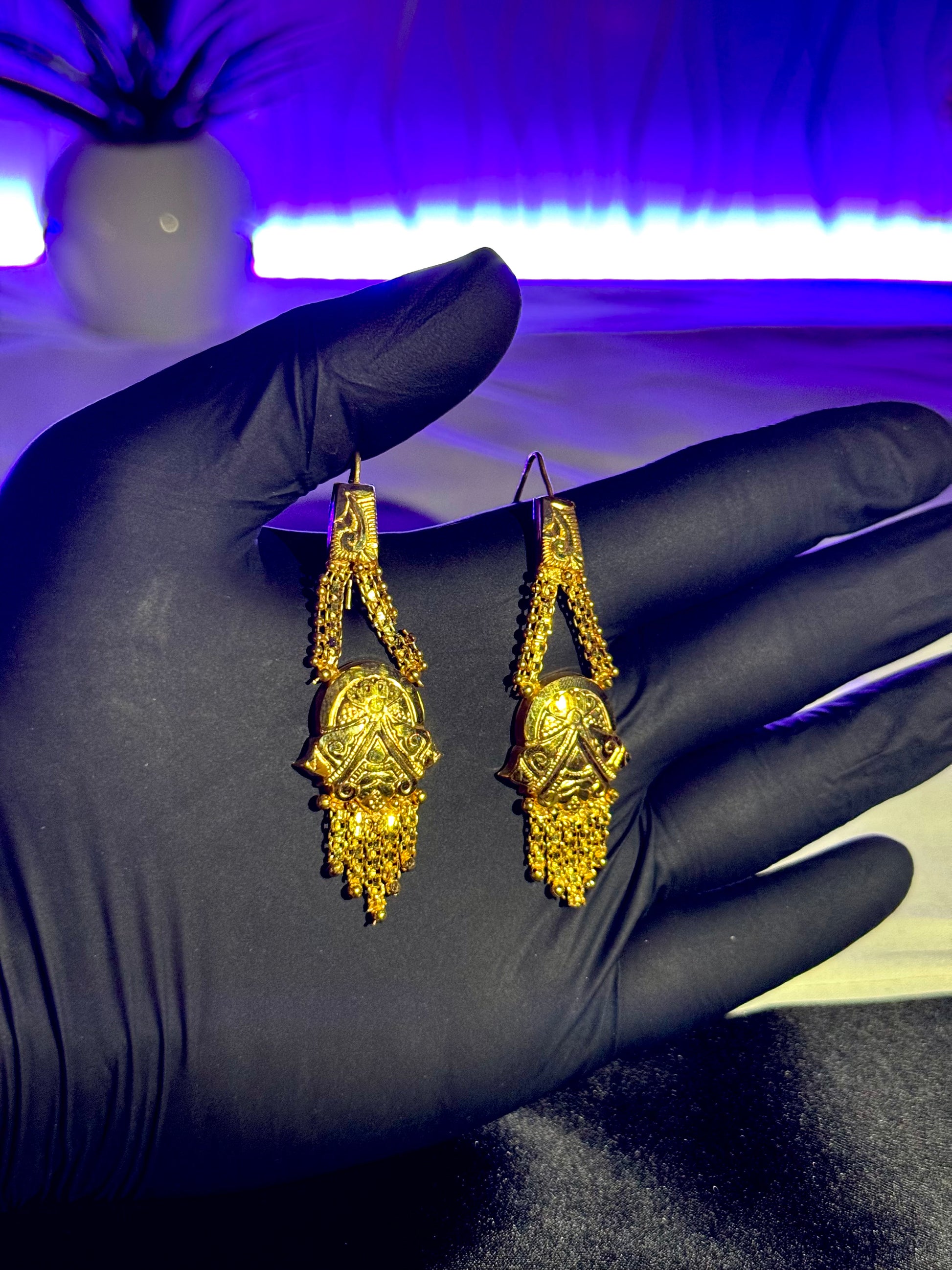 This stunning Gold plated Gaani set is a true showstopper! It features a breathtaking gaani (necklace) with intricate designs and delicate dangling charms that catch the light with every movement. The gaani's centerpiece is a beautifully crafted motif surrounded by tiny golden accents that add to its elegance.