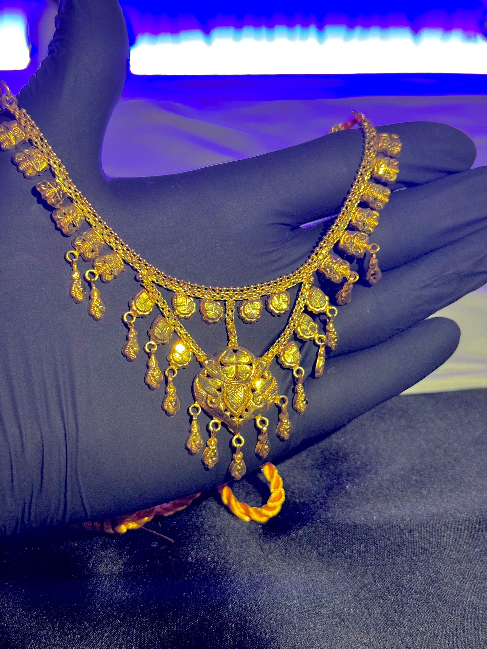 This stunning Gold plated Gaani set is a true showstopper! It features a breathtaking gaani (necklace) with intricate designs and delicate dangling charms that catch the light with every movement. The gaani's centerpiece is a beautifully crafted motif surrounded by tiny golden accents that add to its elegance.