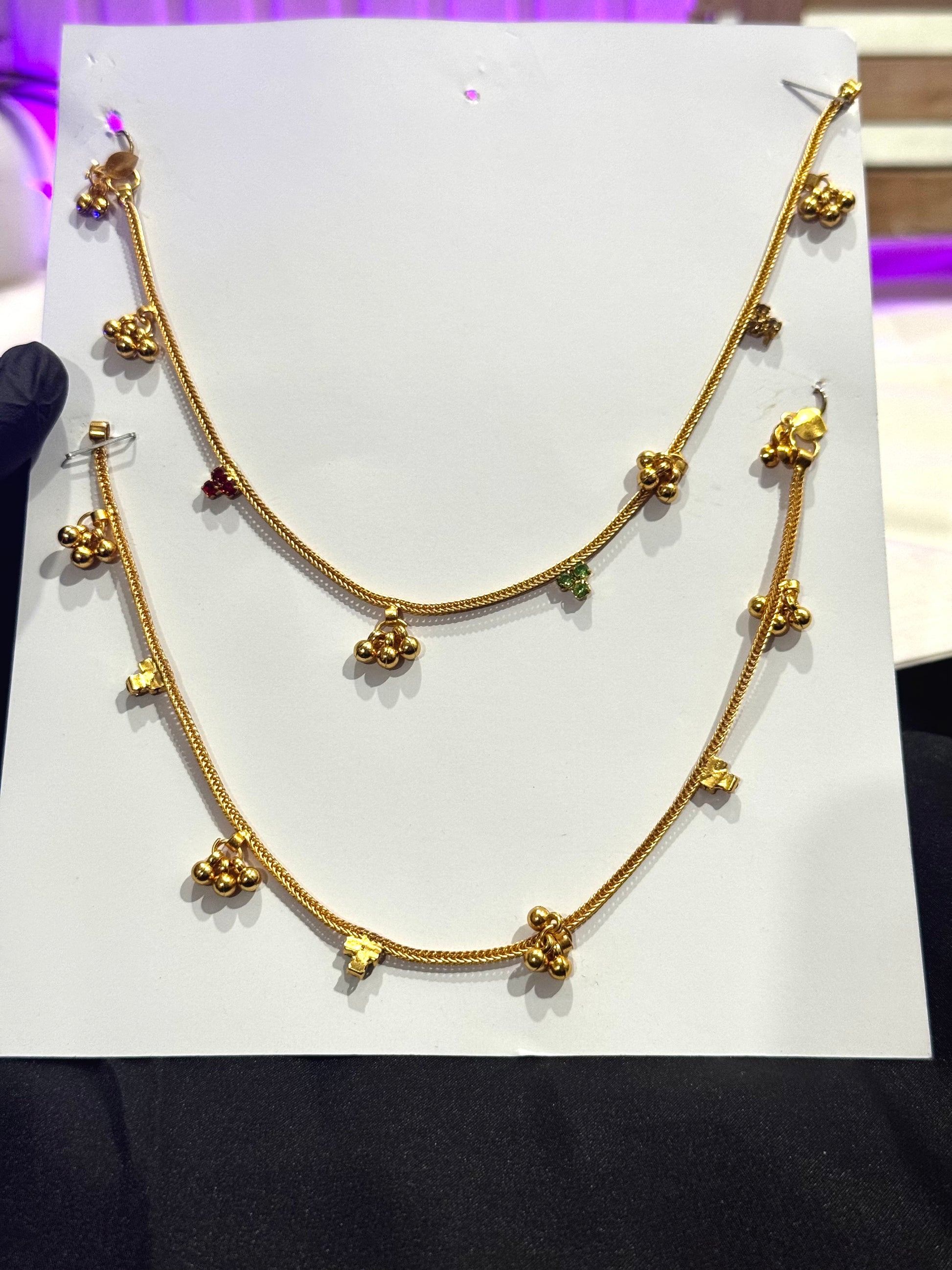 These stunning Gold-toned Anklets are mesmerising , Crafted with delicate gold chains and adorned with flower-shaped motifs, these anklets add a touch of elegance to any outfit. One anklet features tiny colored stones - red and green - adding a pop of color to the gold design. The flower motifs are intricately designed with small gold balls, giving a 3D effect. Perfect for dressing up for Eid, weddings, or any festive occasion in Pakistan.