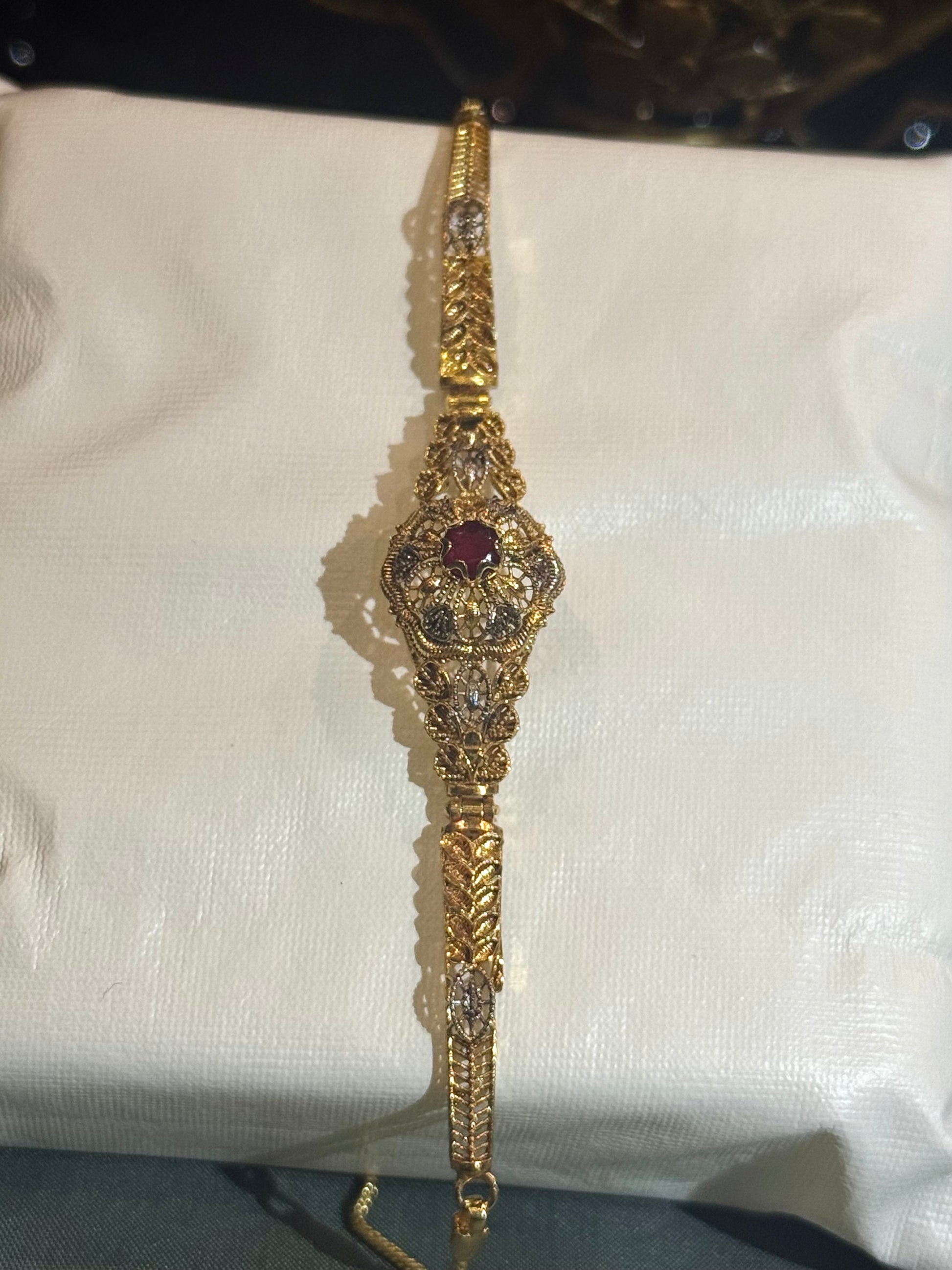 Add a touch of sophistication to any outfit with this stunning gold plated bracelet! Featuring an intricate design adorned with sparkling details, this bracelet boasts a unique, eye-catching pattern. The gold plating gives it a luxurious look perfect for dressing up or adding a hint of glamour to everyday wear.Ideal for those who love statement jewelry with a blend of traditional and modern aesthetics.