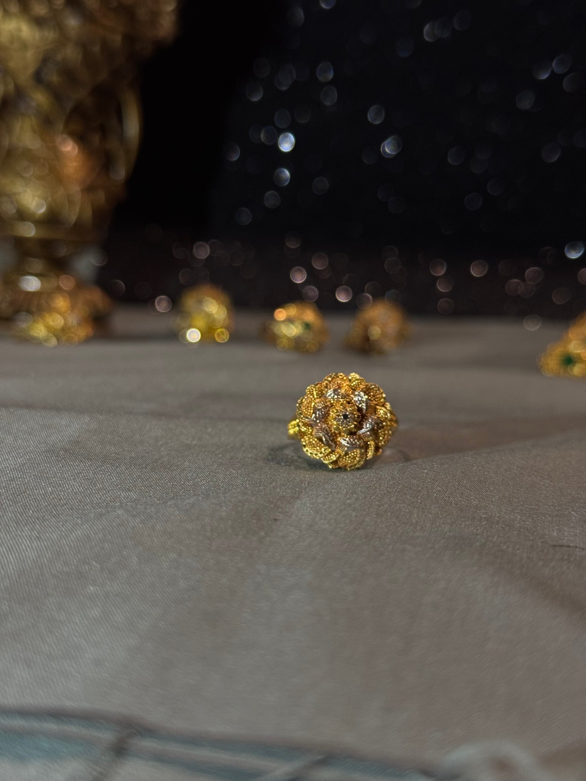 This R.P Gold Plated (Rg011) ring in the image showcase a high level of craftsmanship with intricate filigree designs. The finishing appears polished, giving the rings a luxurious look. The quality seems to emphasize detail and aesthetic appeal, typical of ornate gold jewelry often seen in traditional or cultural pieces.