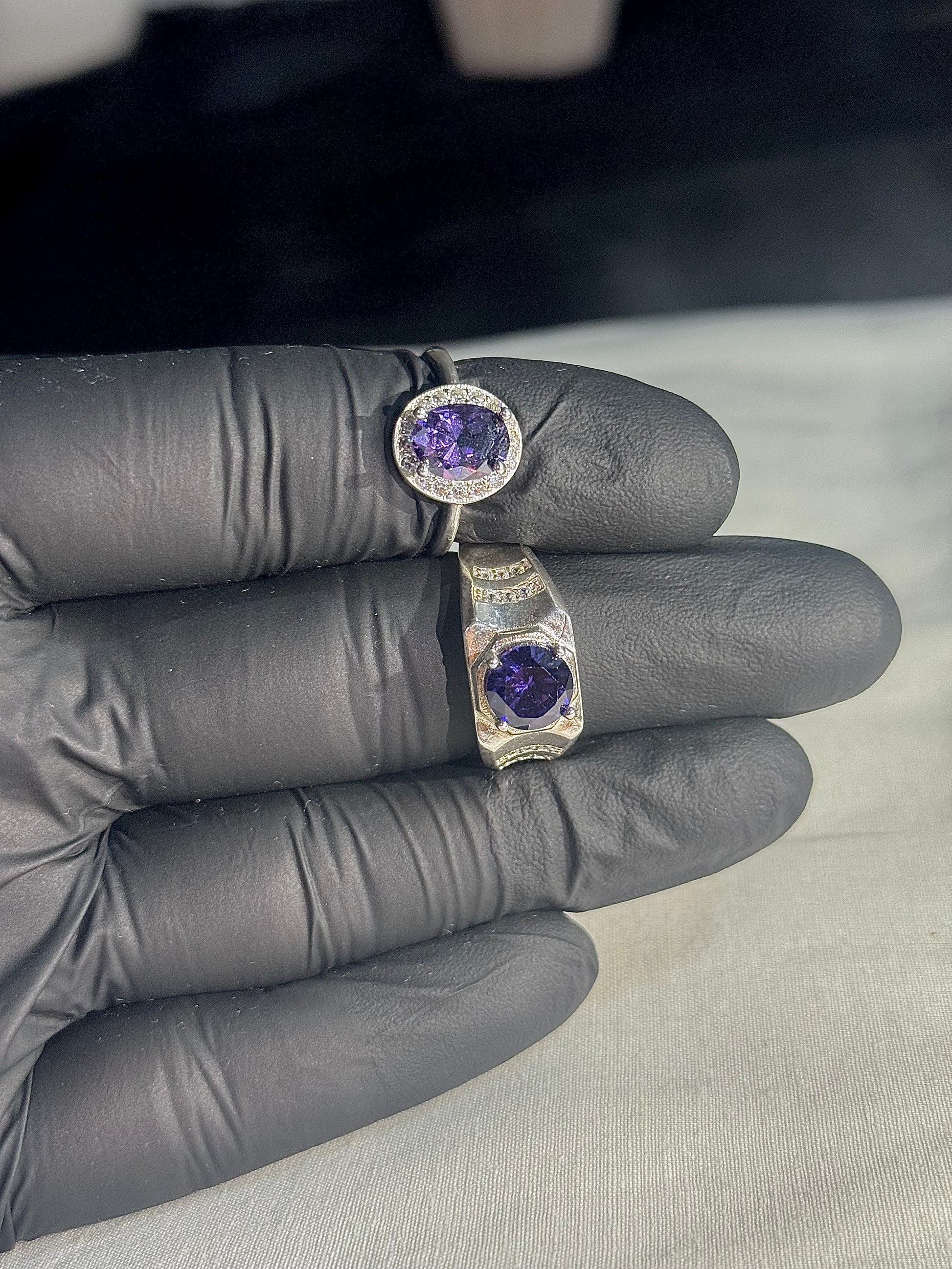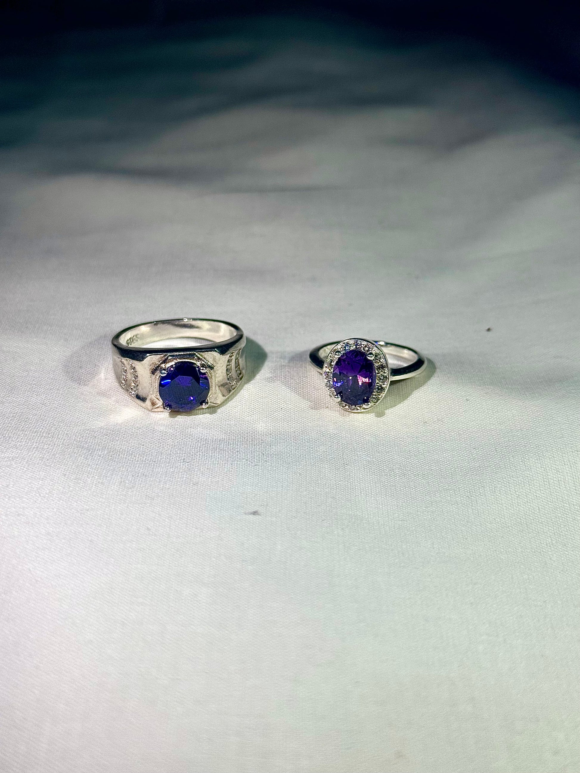 This exquisite couple ring is a masterpiece of love and elegance! A stunning purple gemstone takes center stage in a delicate flower-like setting, surrounded by sparkling diamonds that add a touch of luxury and sophistication. The ring's geometric base is encrusted with tiny diamonds, creating a truly eye-catching design. Perfect for couples who want to shine bright together, this ring is a beautiful symbol of devotion and commitment, radiating timeless beauty and charm