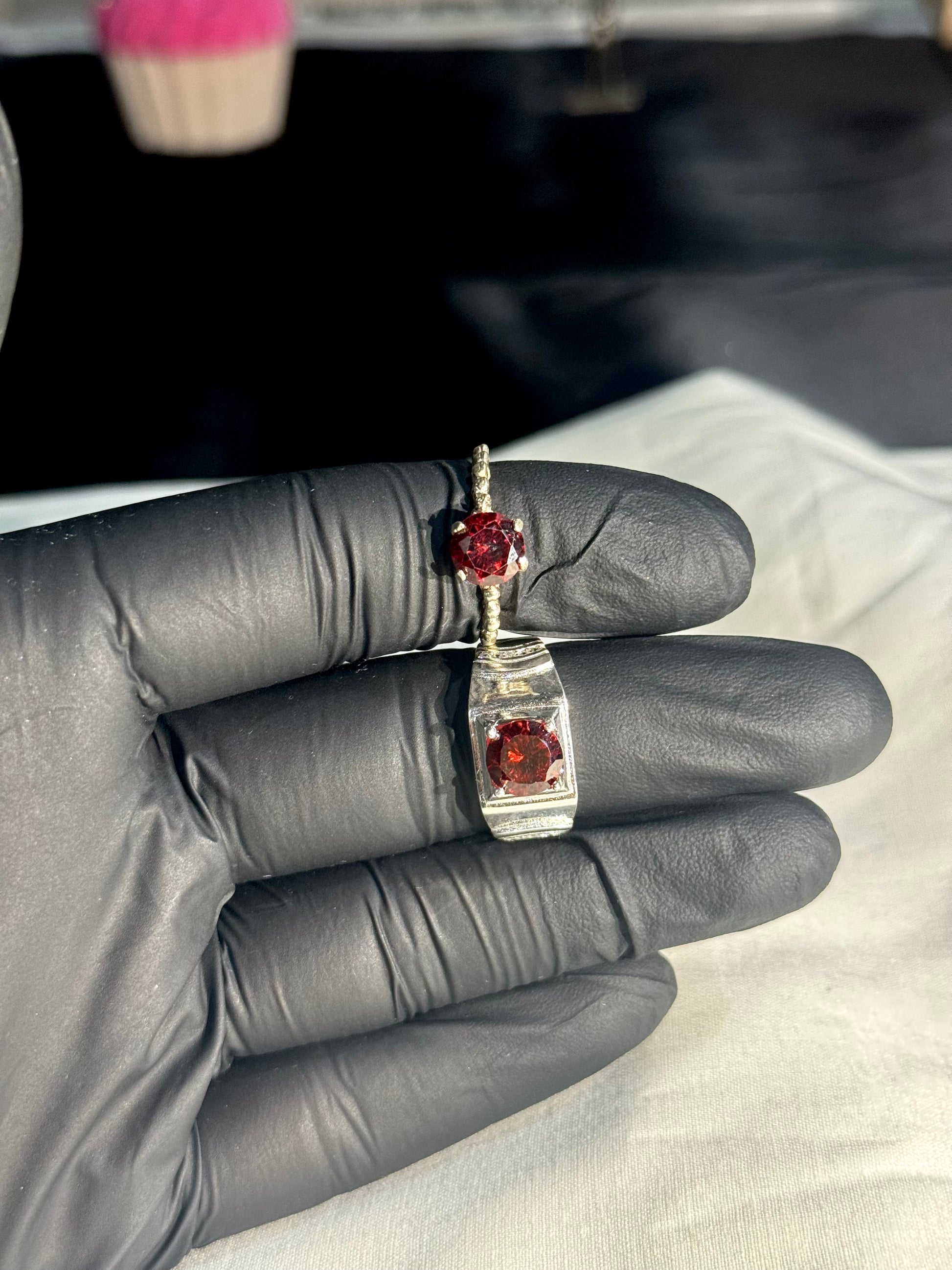 These two rings are astonishing work of art. Both rings are silver with deep red gemstones.