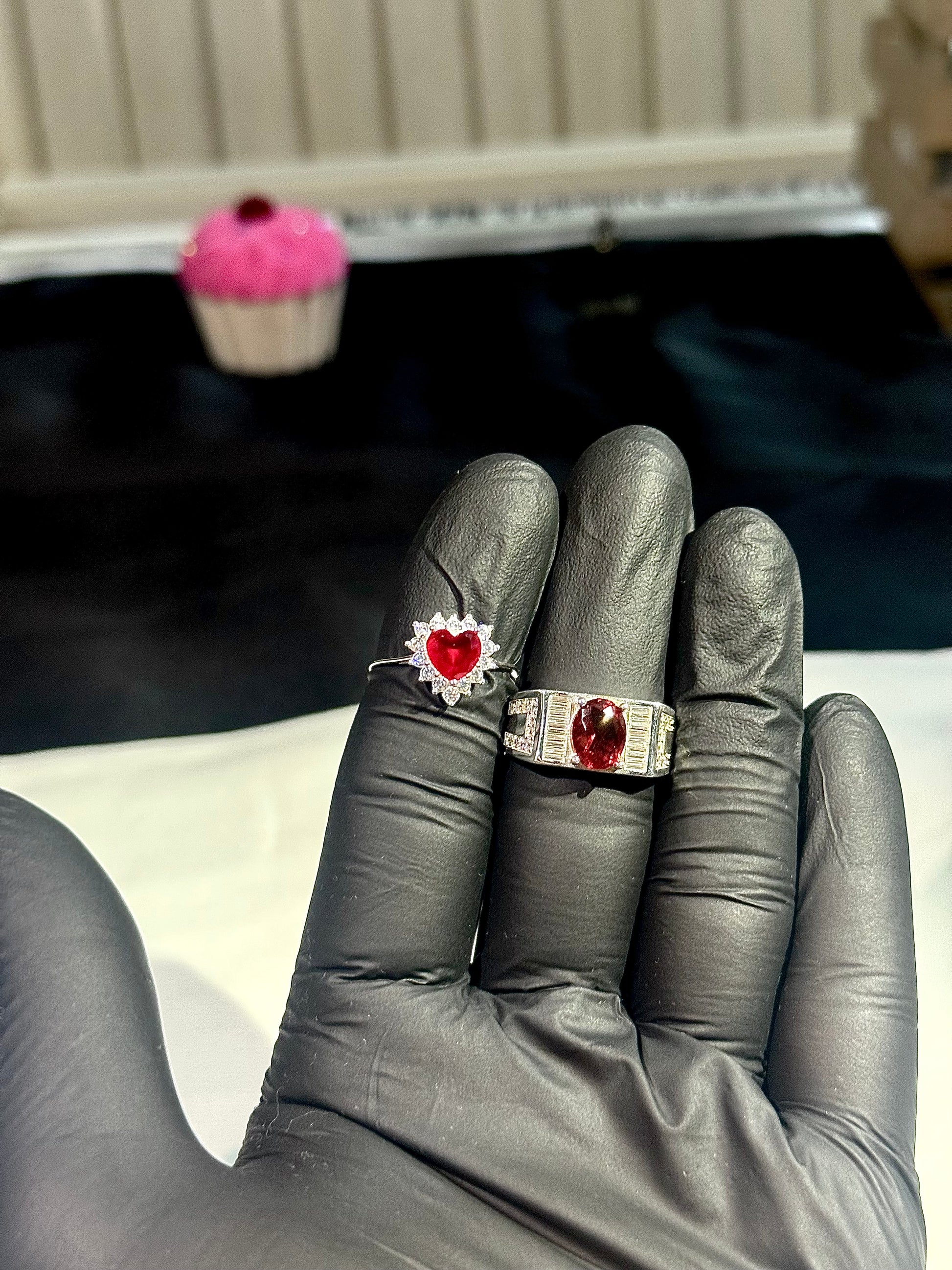 These Italian couple rings are incredibly cute! You've got two stunning silver rings with gorgeous red stones that scream romance! One ring's got a heart-shaped red stone surrounded by sparkly diamonds, and the matching ring has an oval red gem with baguette diamonds on the sides. They're perfect for a couple as a symbol of love