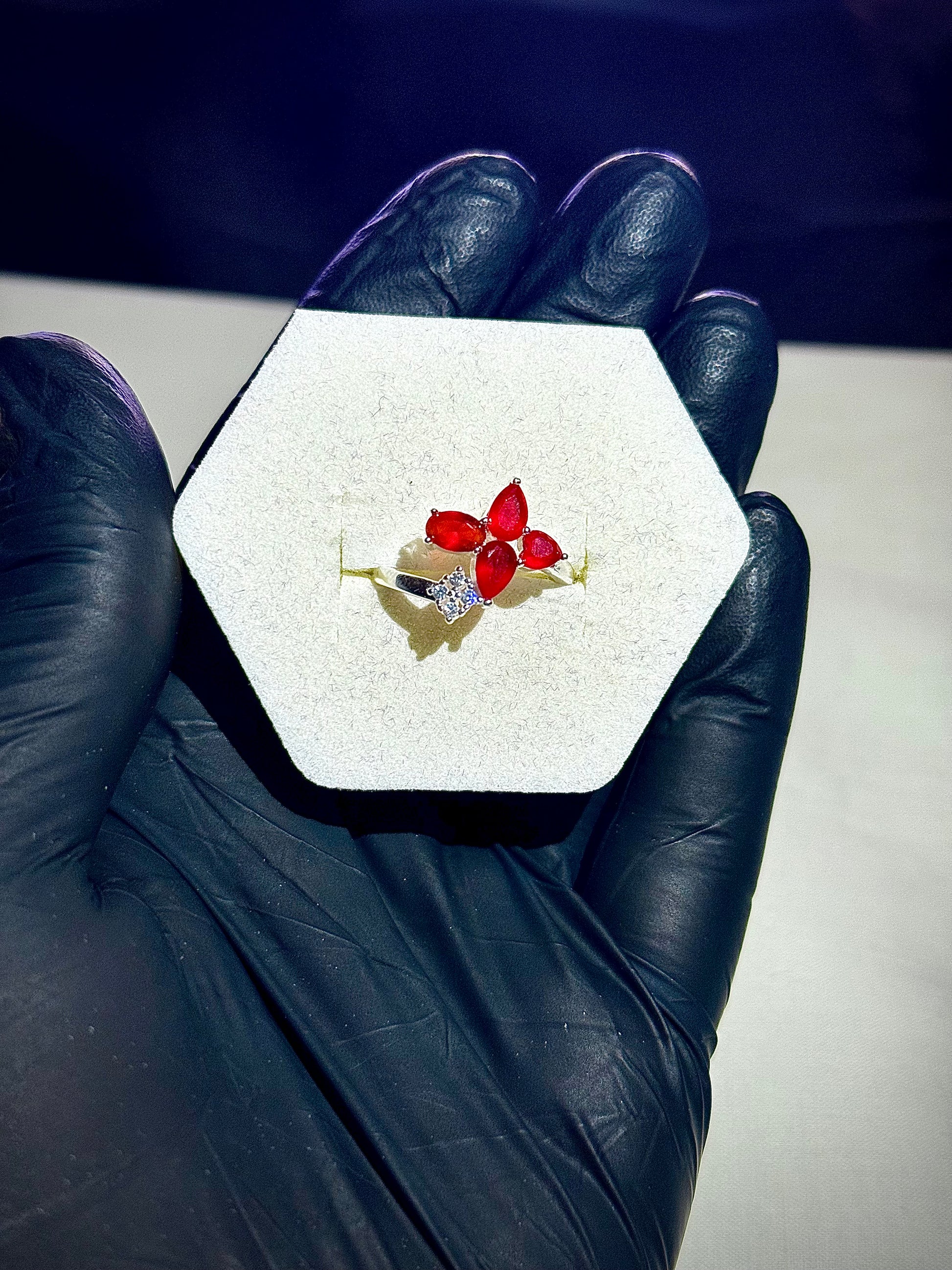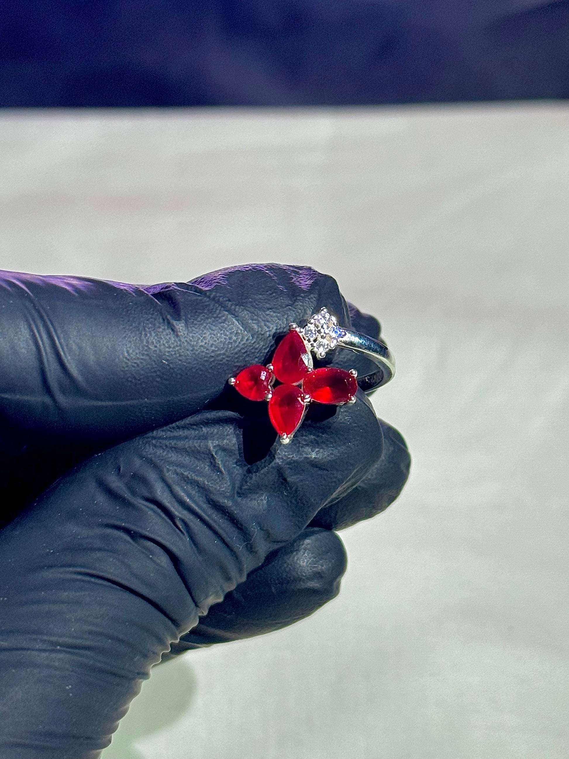 This stunning ring features a delicate floral design crafted with four vivid red, teardrop-shaped stones arranged like petals, creating a bold yet graceful centerpiece. Accented with a sparkling cluster of small white stones on one side, the ring blends charm and sophistication effortlessly. The slim gold band adds a touch of refinement, making it a perfect statement piece for any occasion.