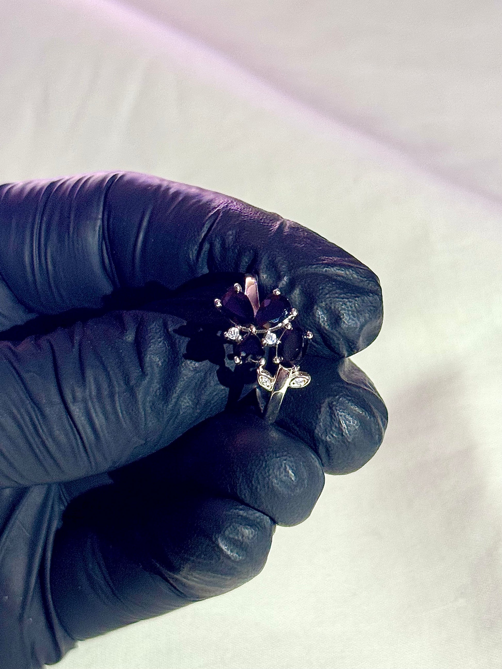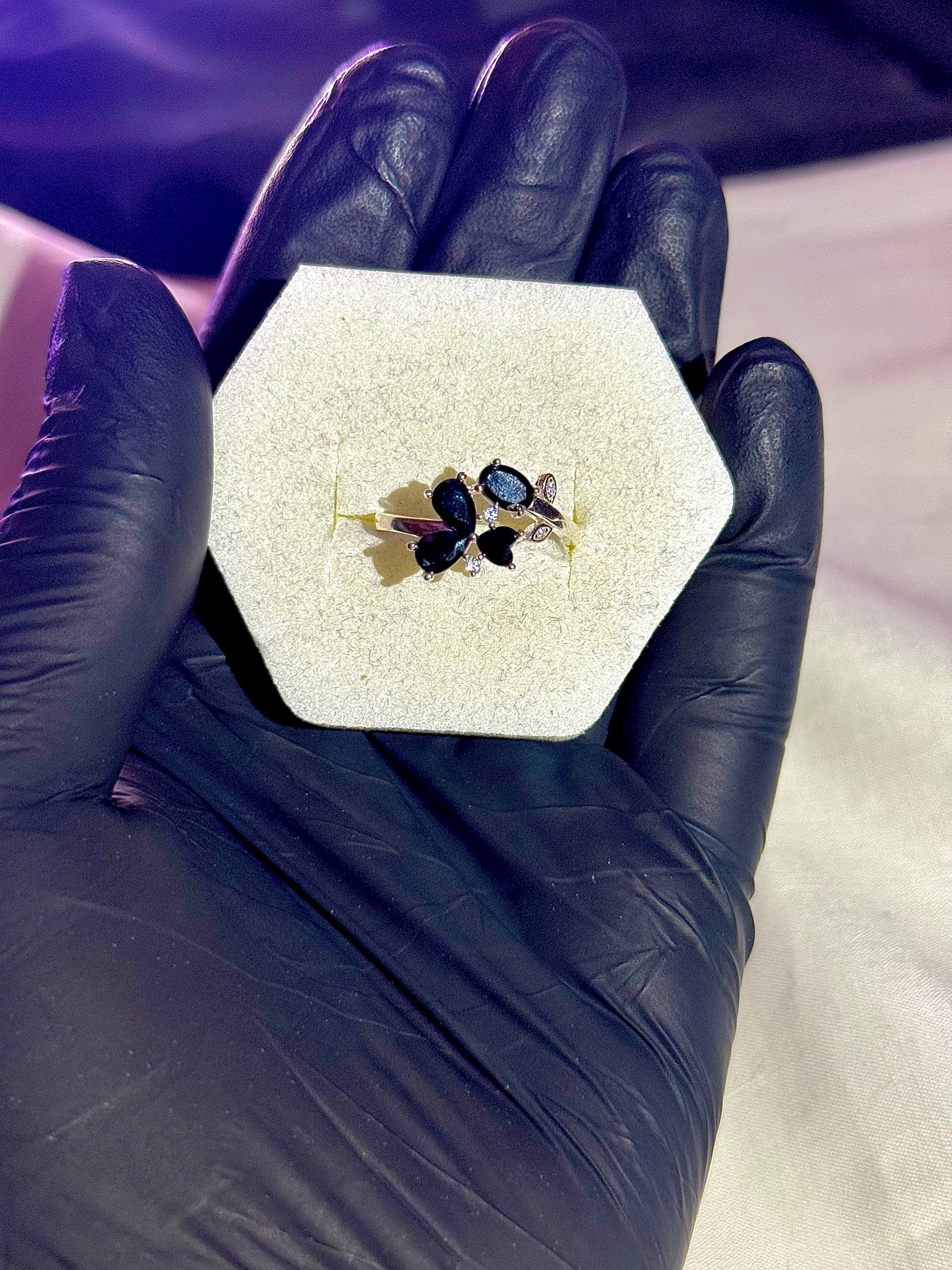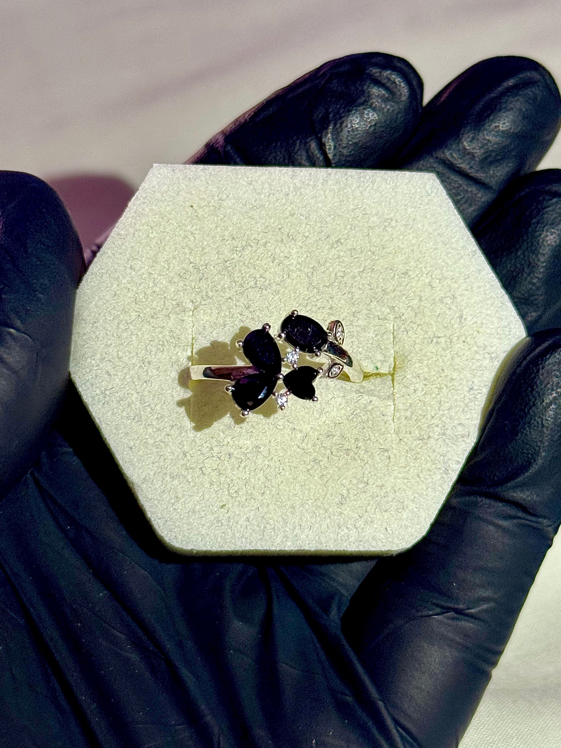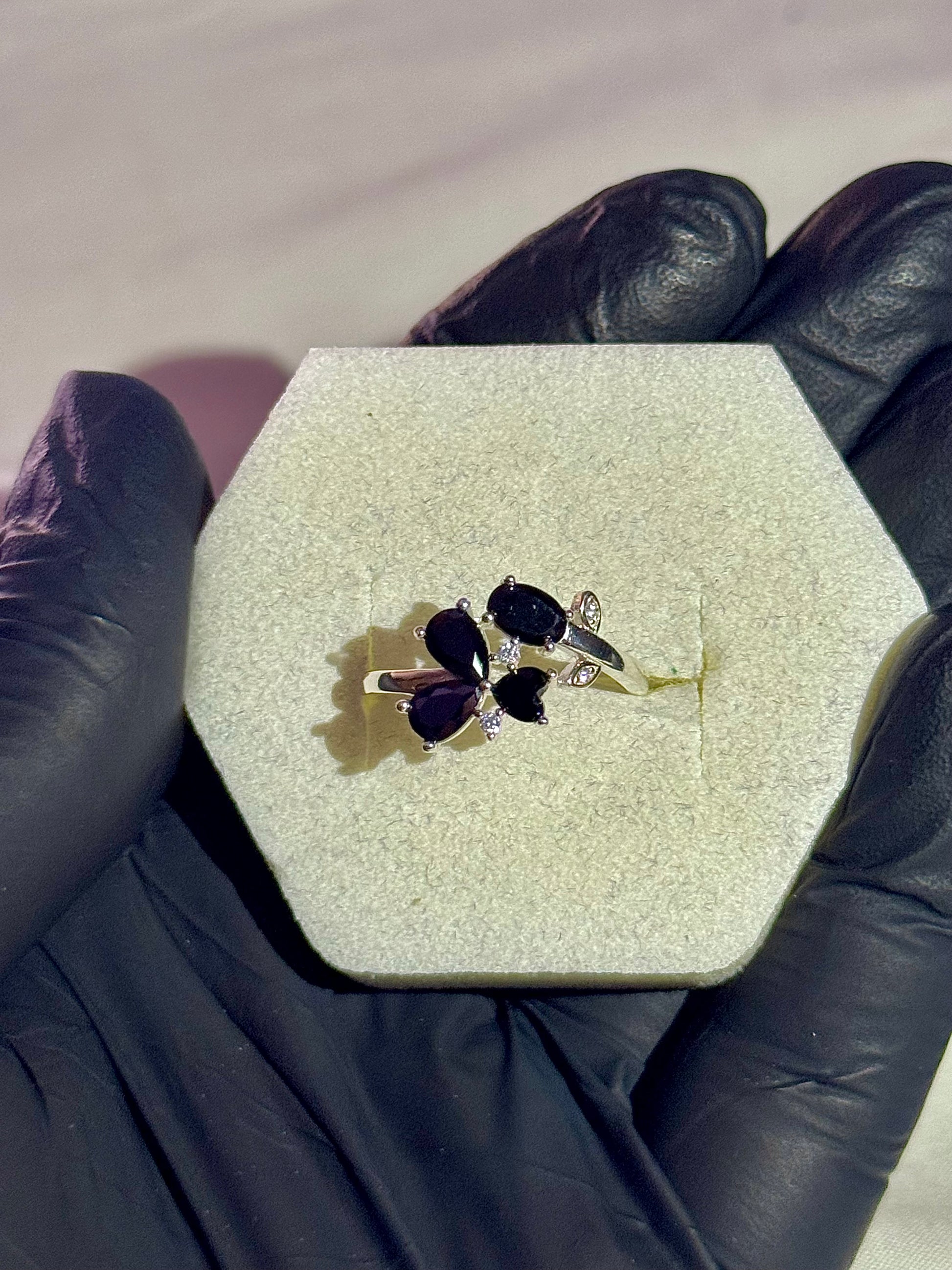 This italian ring features charming heart and oval shape black stones along with small white diamond like stone. Adorned with small stones this ring carries a leaf like structure with heart shape making the ring a beautiful and elegant wearing accessory