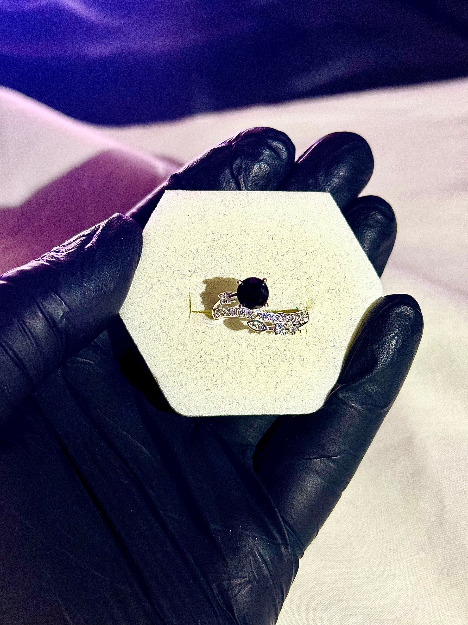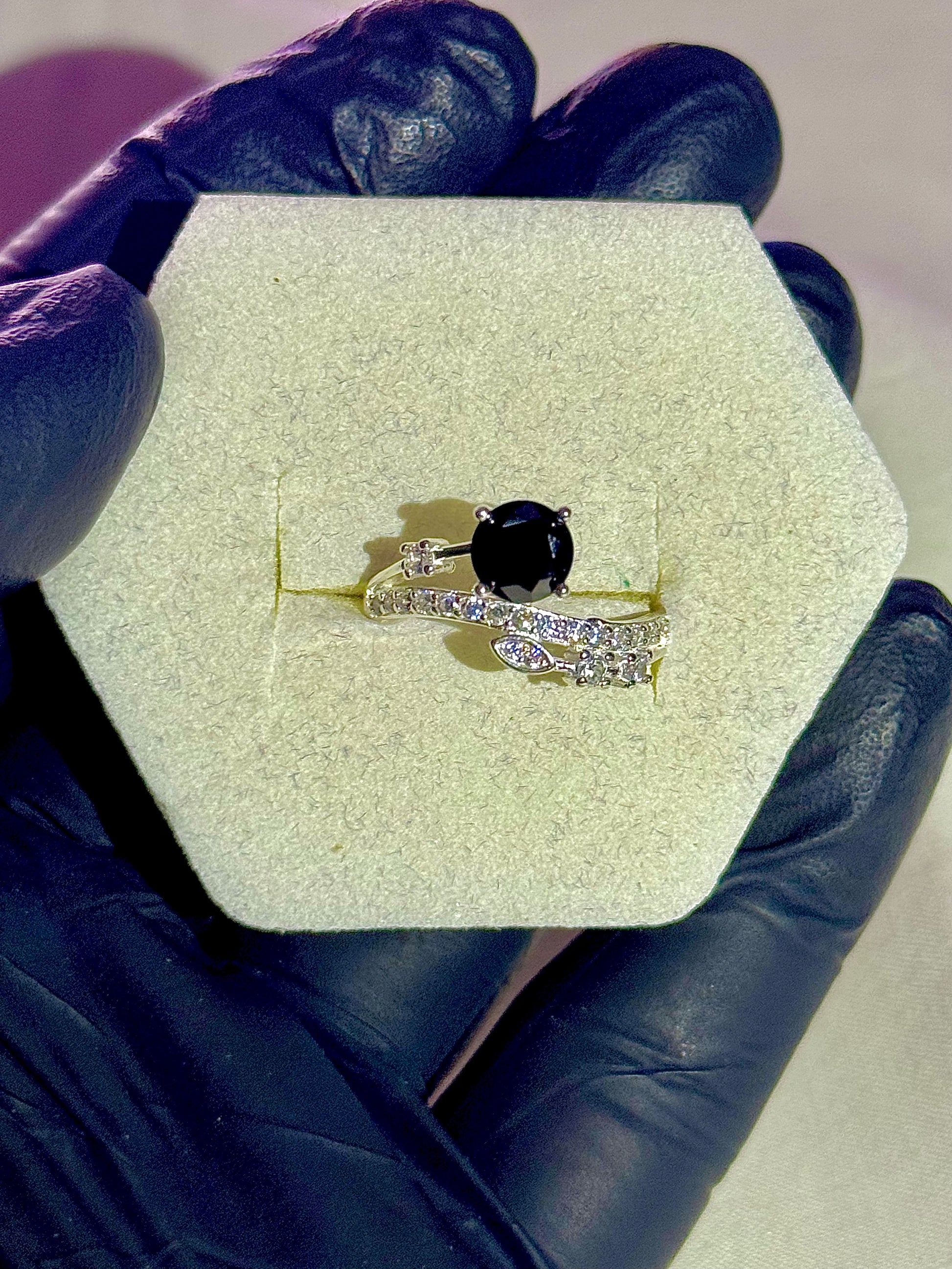 This silver ring features a round black gemstone set in a four-prone setting. The band is adorned with small diamonds or clear stones on either side of the gemstone, giving it a sleek and elegant look