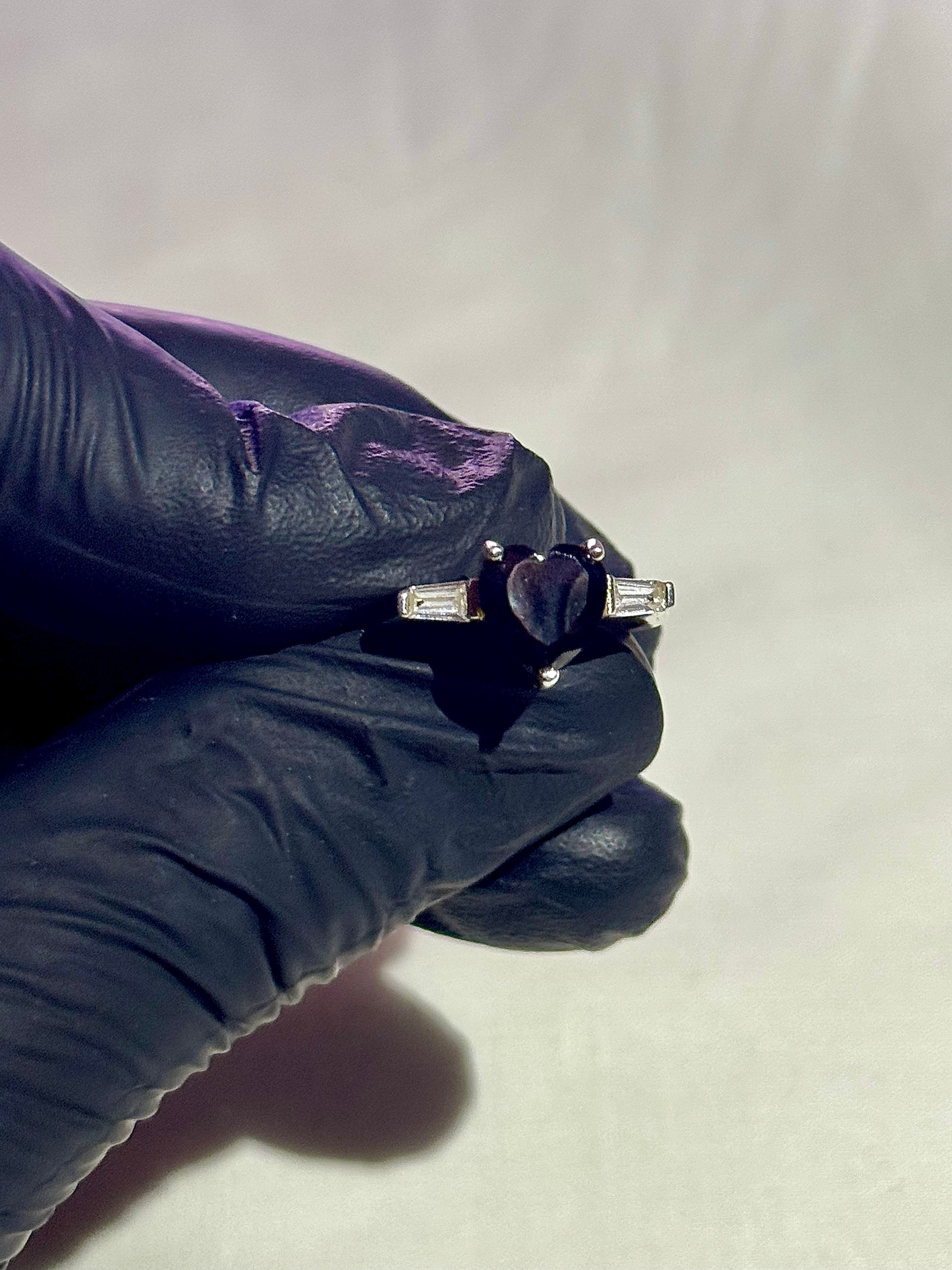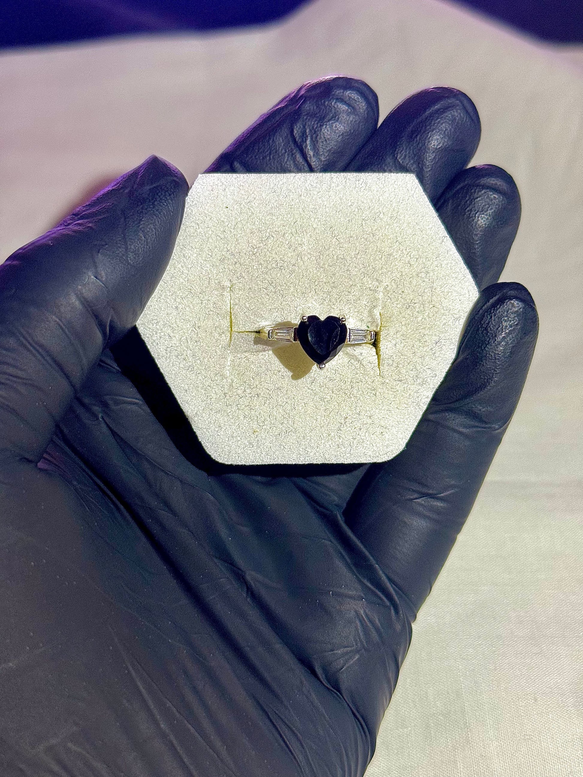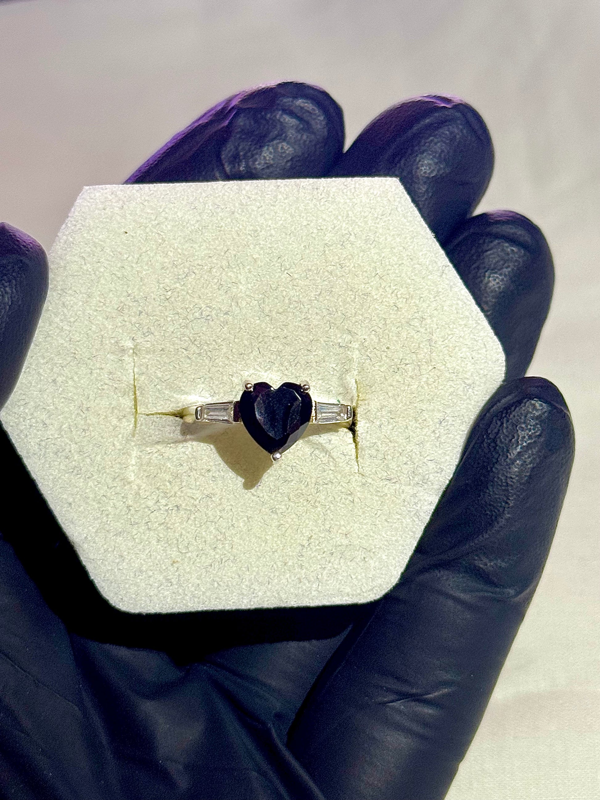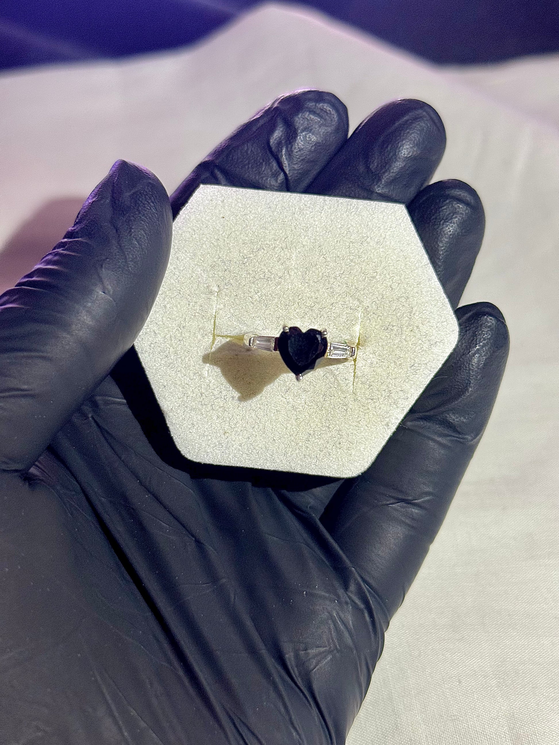 This silver ring features a heart-shaped black stone (likely an amethyst) as its centerpiece. On either side of the heart-shaped stone, there are baguette-cut clear stones (crystal stone) set in silver.