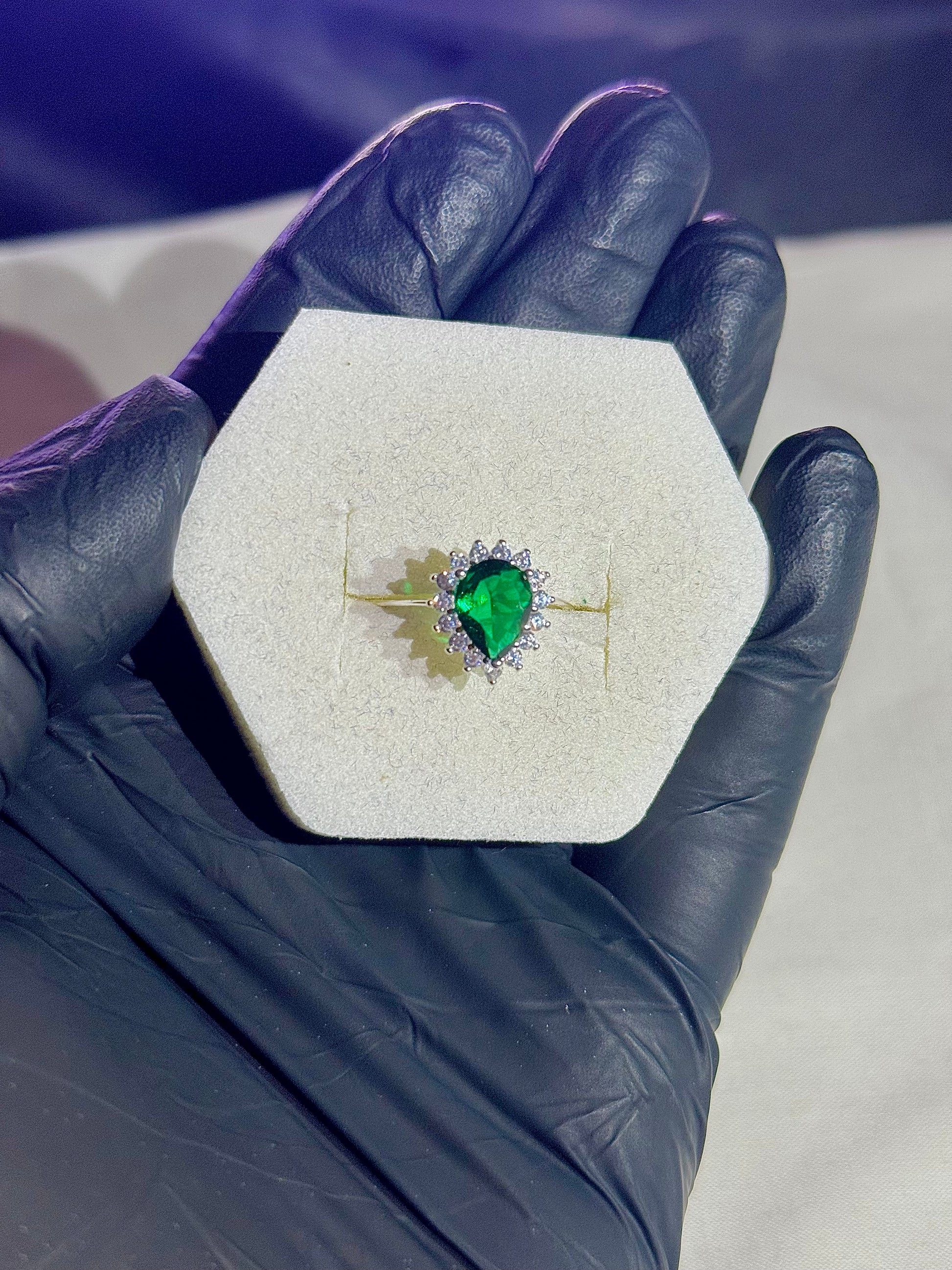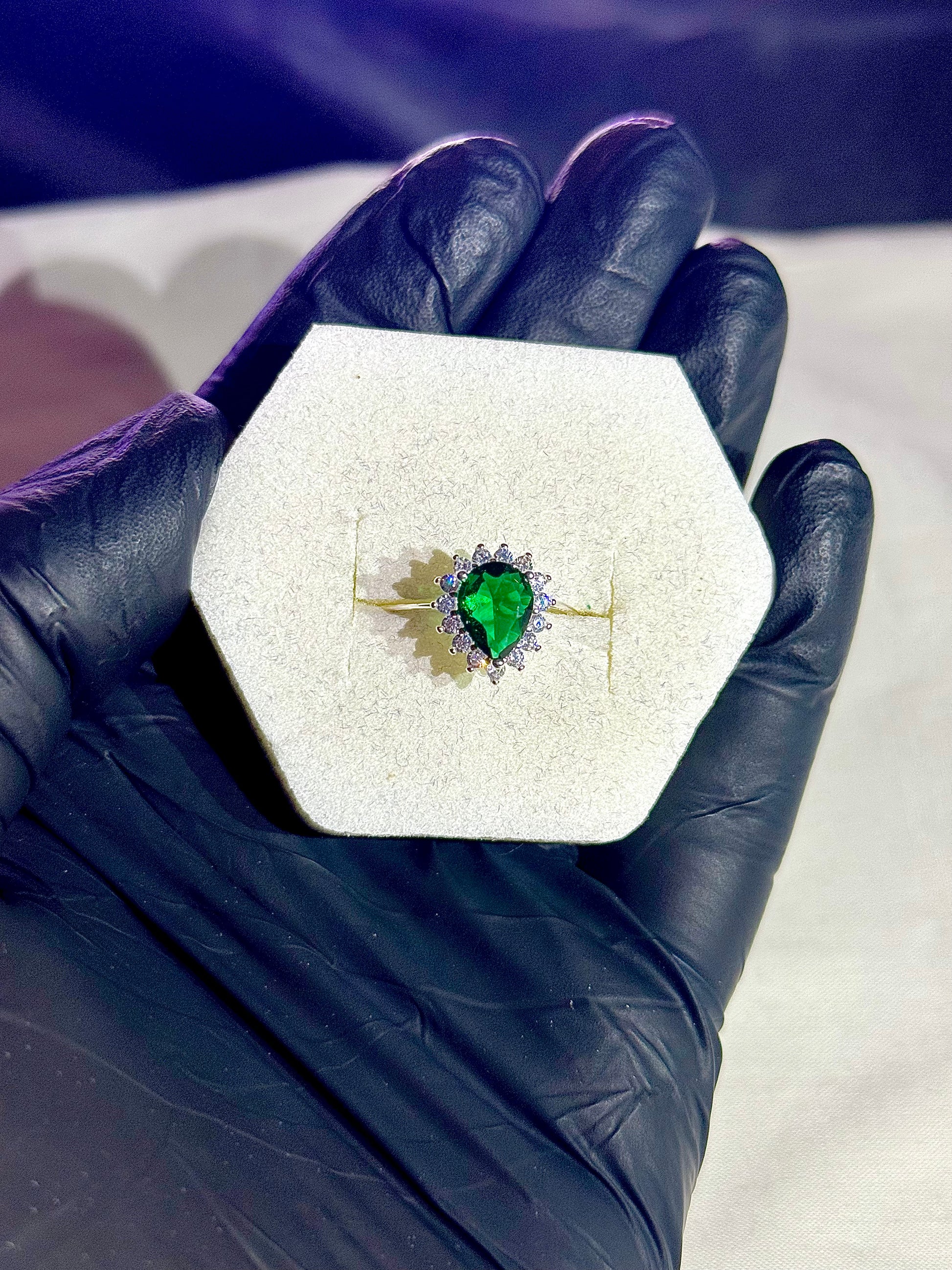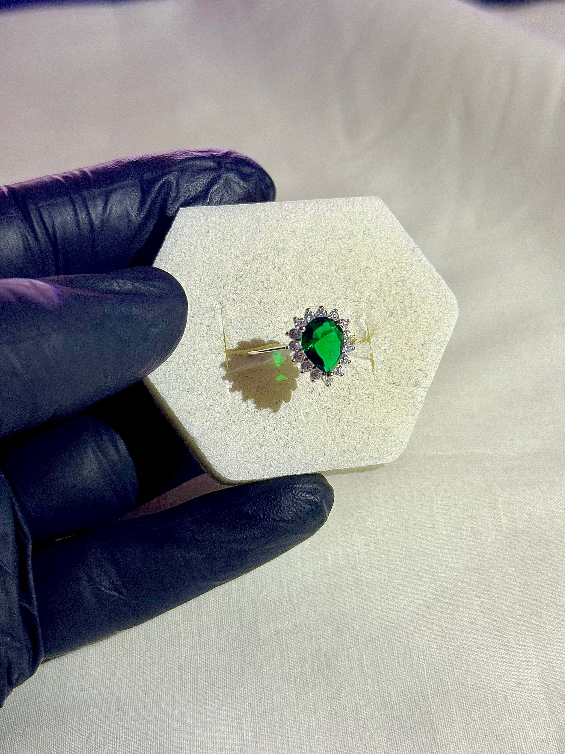 This silver ring features a stunning green gemstone, likely an emerald, at its center. The gemstone is pear-shaped and surrounded by a halo of small diamonds clear stones, adding extra sparkle. The ring's design is elegant with a simple band leading up to the gemstone setting.