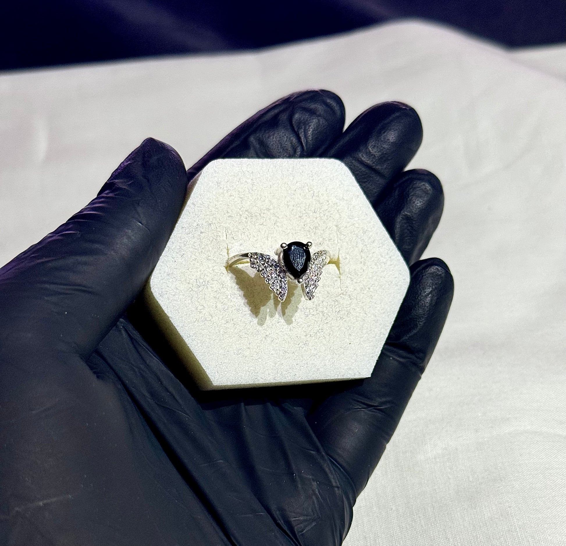 This silver ring features a butterfly like design with dark black stones forming the butterfly's body and wings. There's a small white stone accent on each wing, adding a touch of contrast. The ring's design is delicate and intricate, with the butterfly motif being the main focus.