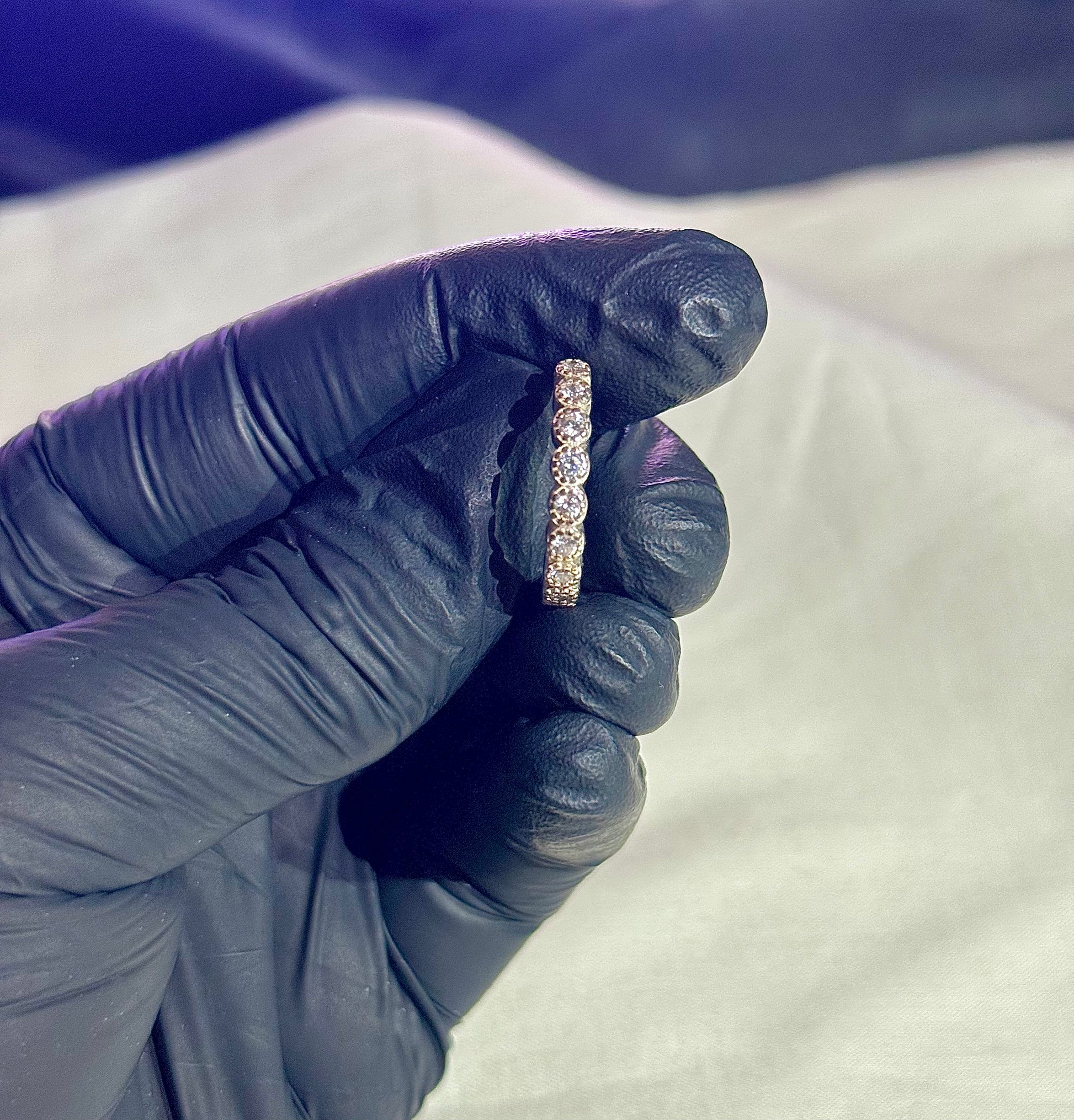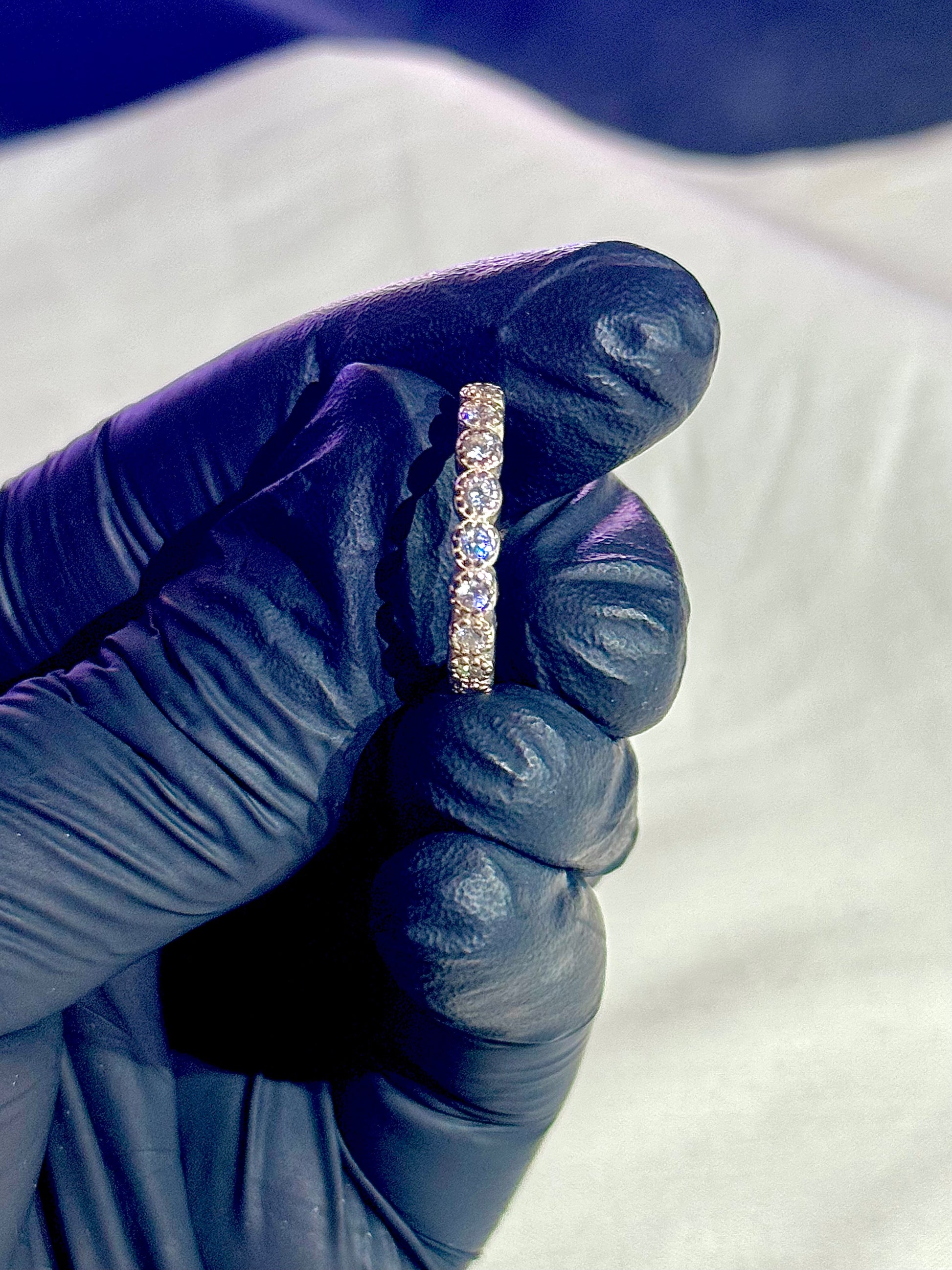 This italian ring features a band with seven small diamonds like stones set in it. The gems are round and spaced evenly across the band.