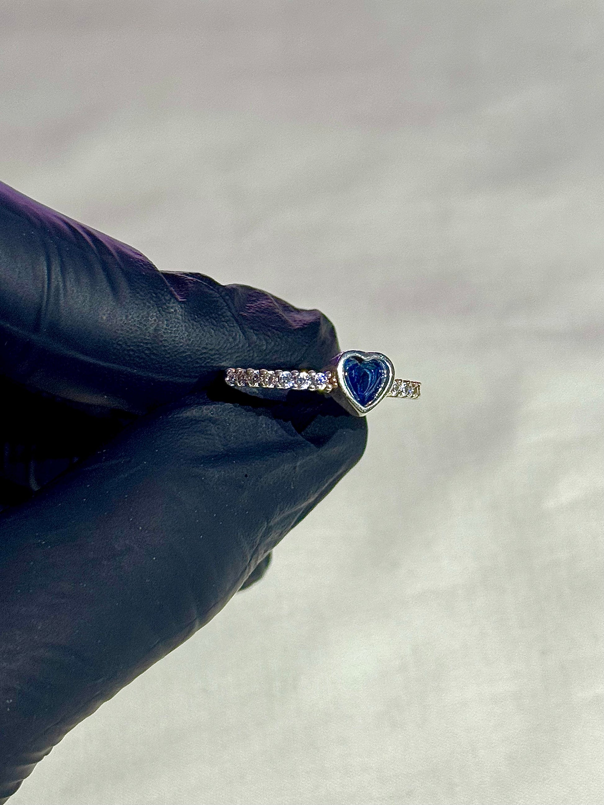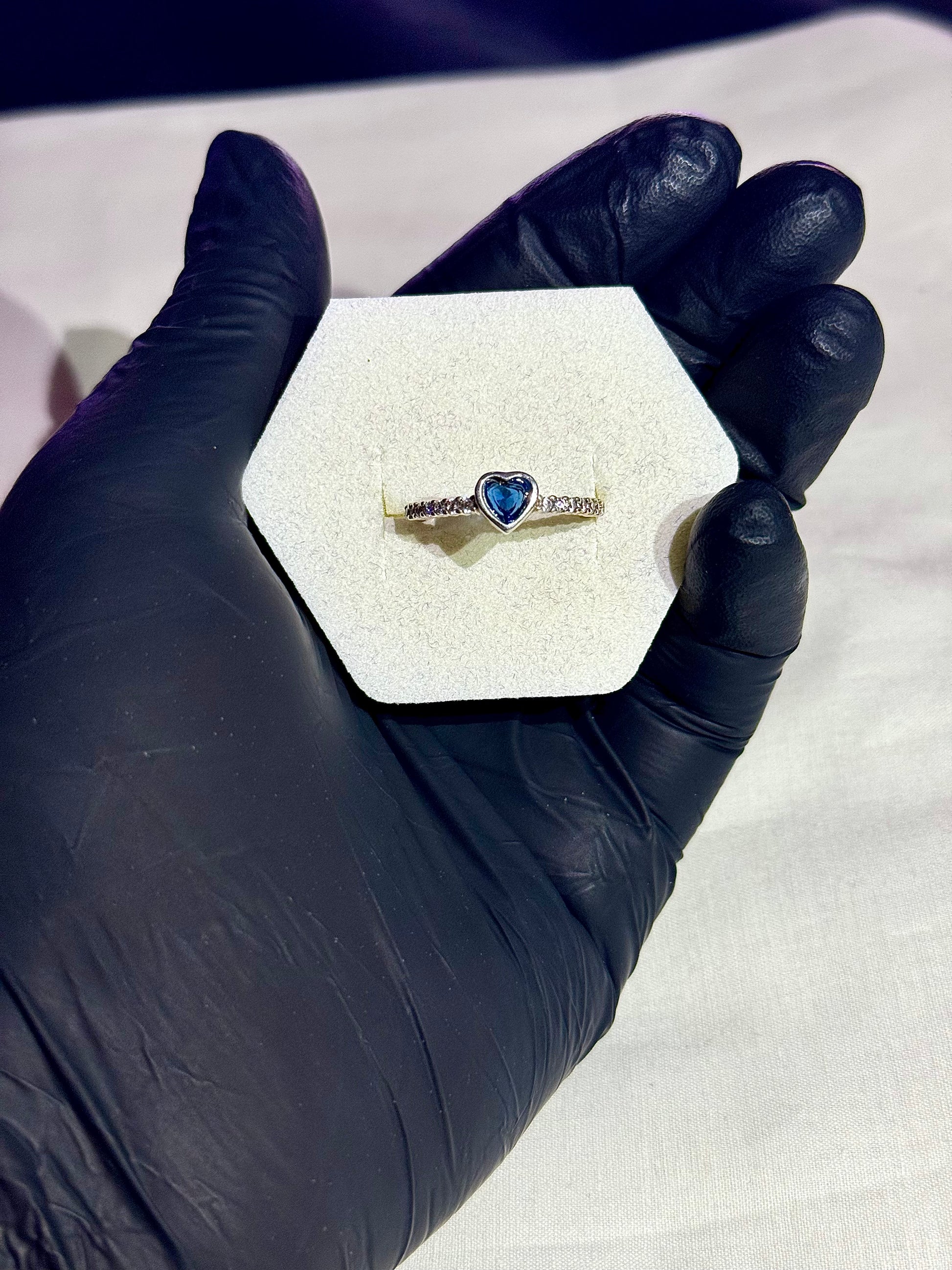 This silver ring features a heart-shaped blue gemstone at its center, surrounded by a silver bezel setting. The band of the ring is adorned with small diamonds or clear stones on either side of the heart-shaped gem, adding a touch of sparkle