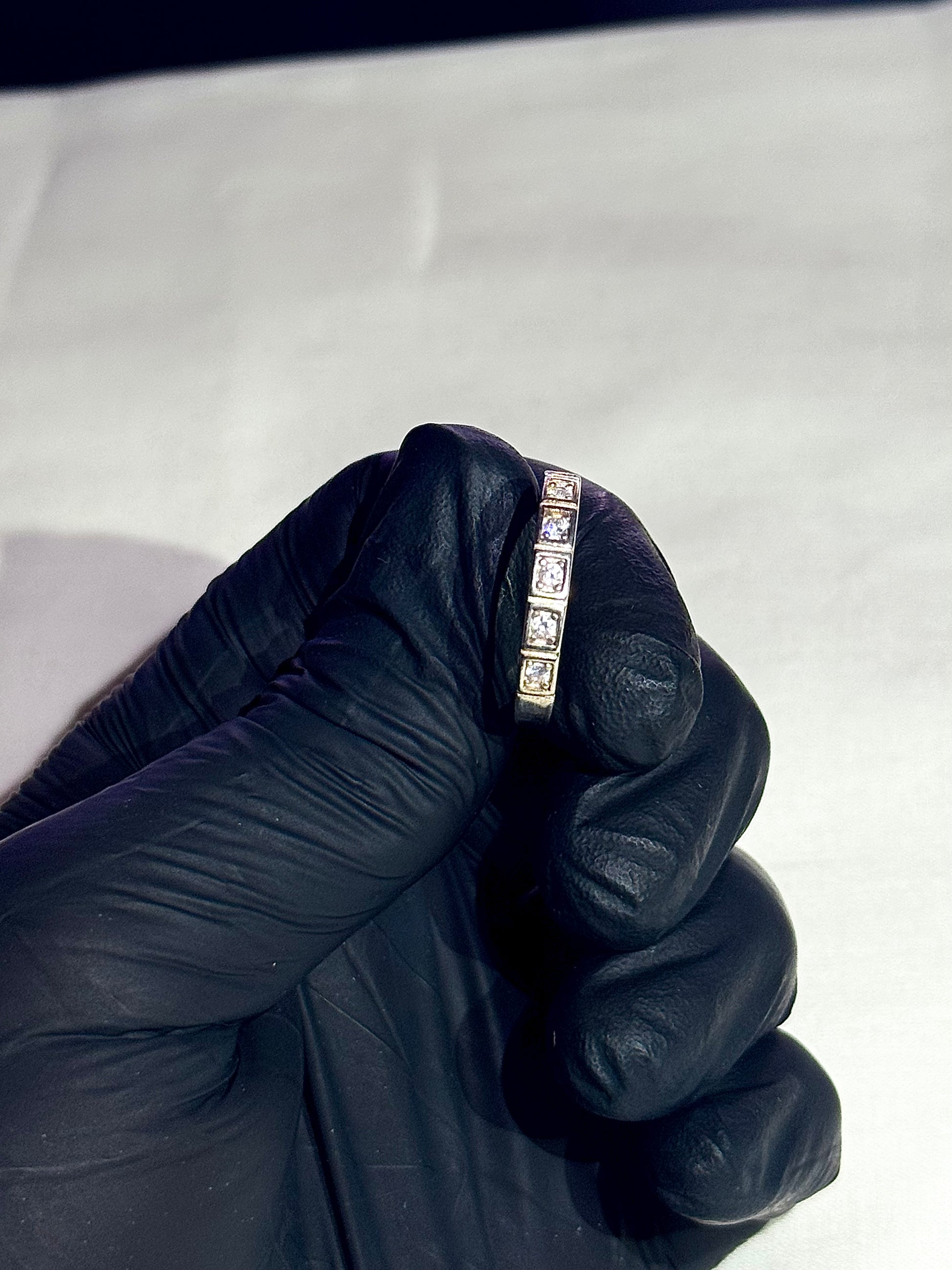 This silver ring features a band adorned with five square-set diamonds-like stones. The stones are arranged in a line along the top of the ring, giving it a sleek and modern look , showcasing the details of the jewelry piece itself.