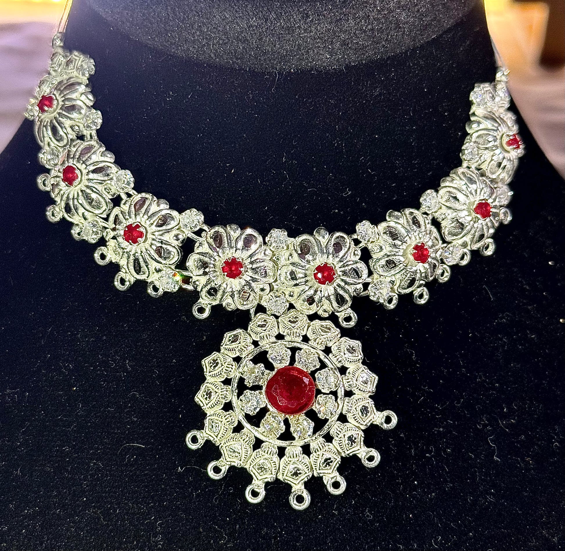 Elevate your traditional look with this astonishing Silver casting Gaani set! Crafted in intricate silver with DETAILED floral patterns and accented with BOLD, Fiery RED stones, this set includes:
