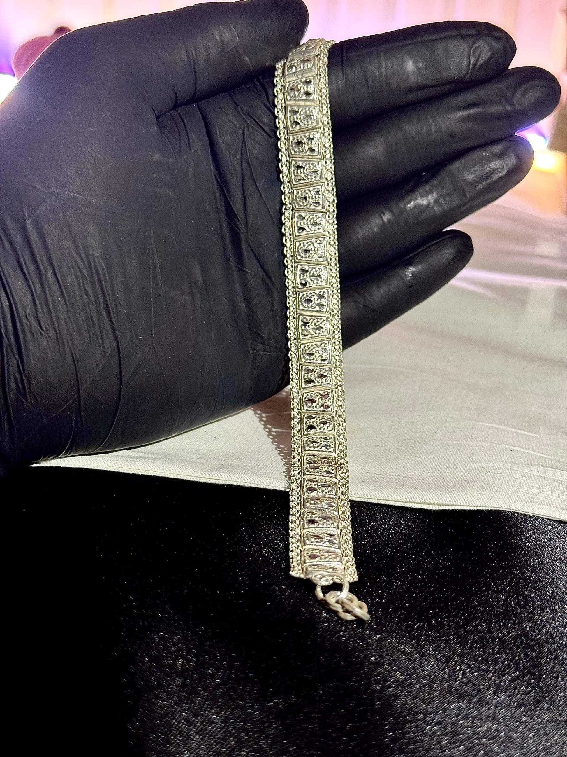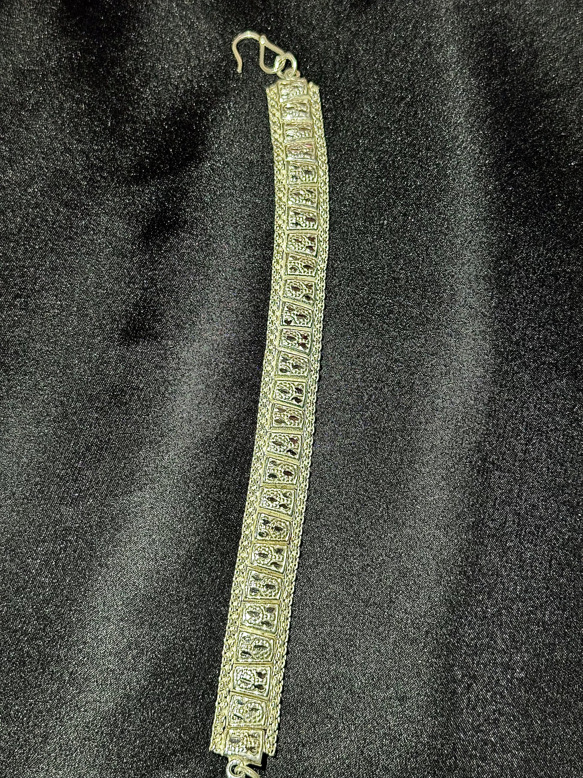 This Silver di-piece Bracelet features a series of rectangular links with textured patterns. The links are connected in a chain-like fashion, forming a continuous band. Each link has a unique textured design within it, adding visual interest to the overall piece. The silver material gives the bracelet a luxurious and elegant appearance.