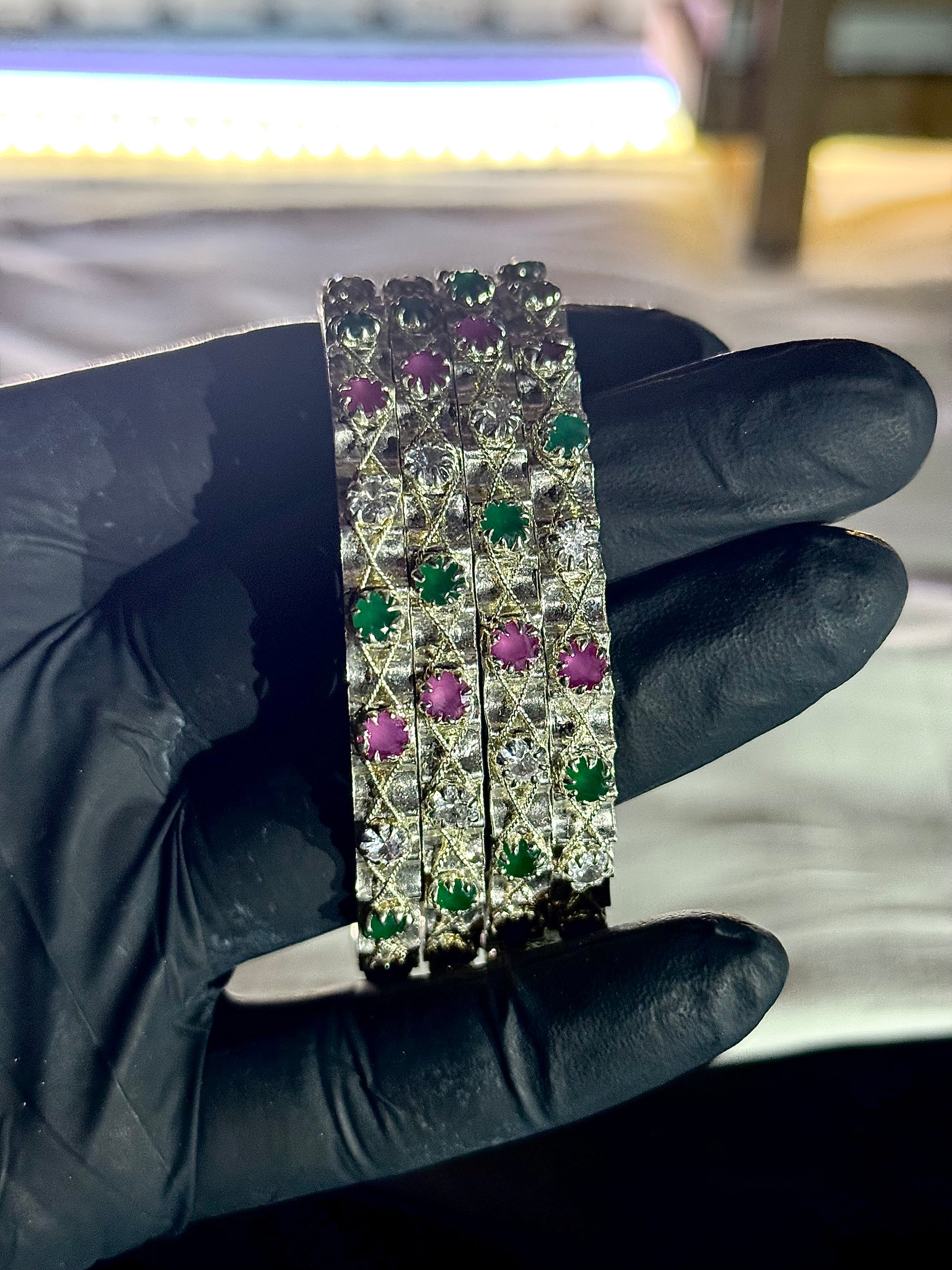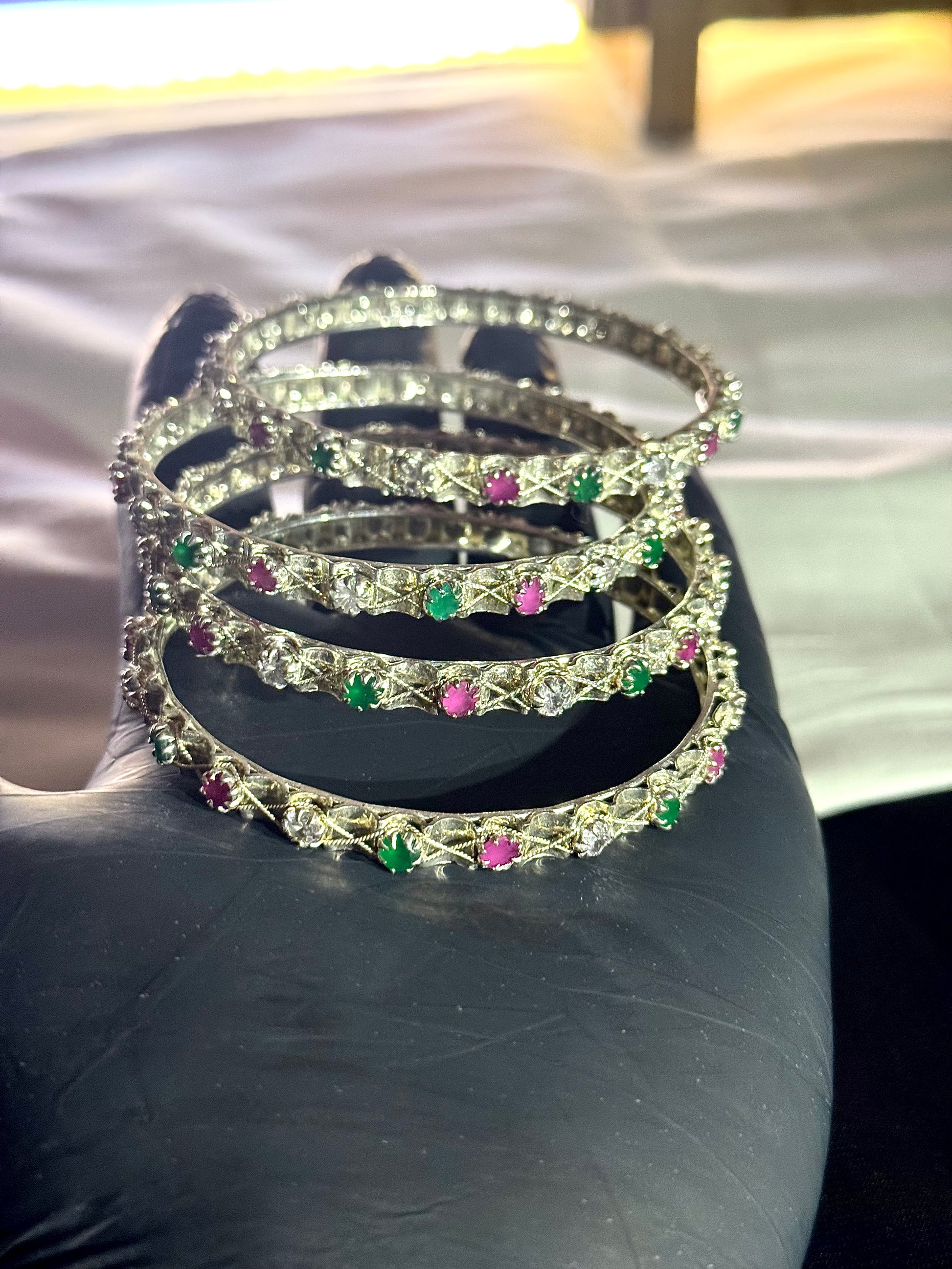 These stunning Silver Stone casting bangles are a total showstopper! Adorned with sparkling clear stones and pops of vibrant green , white & pink gems, they're like a party for your wrists! Perfect for adding a touch of glamour to any outfit. Whether it's a festive occasion in Pakistan or a night out with friends, these bangles will turn heads & make any woman feel like a queen!