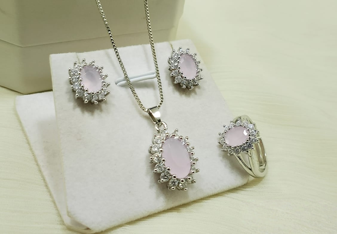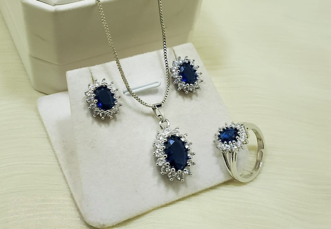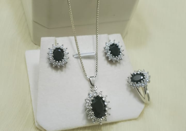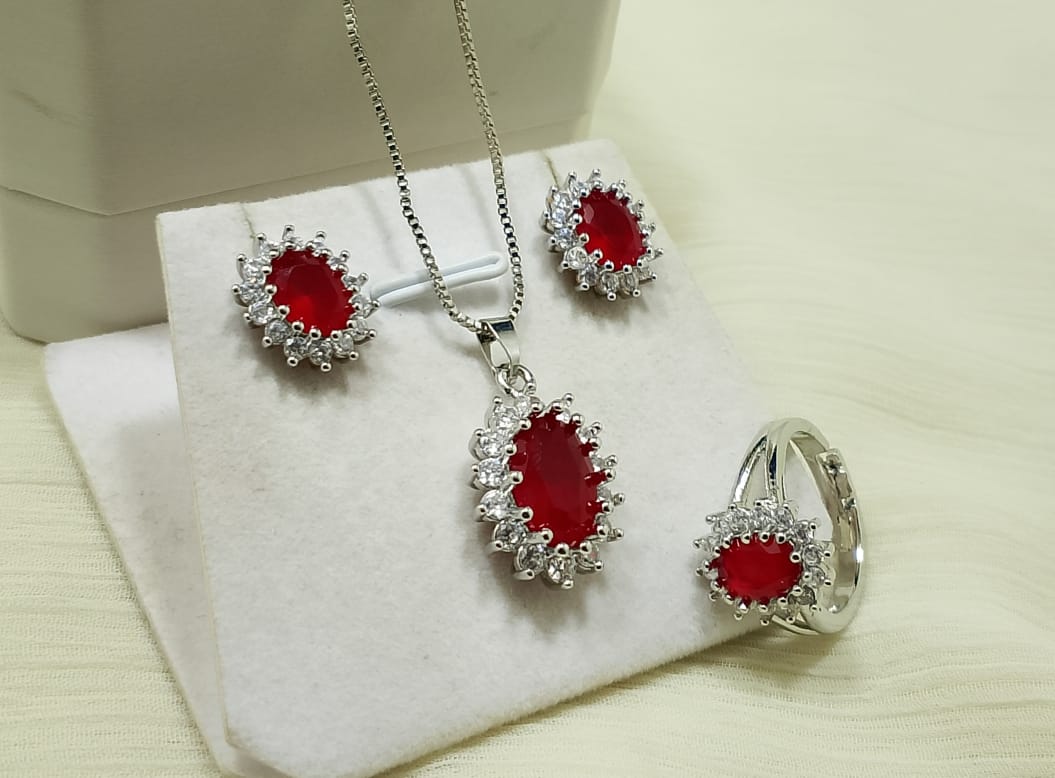 Sunning silver zarcon party wear set featuring vibrant zarcon oval stones surrounded by sparkling accents. The set includes a necklace with a beautifully crafted pendant, matching earrings, and an adjustable ring. Perfect for adding a touch of glamour to any party outfit. The combination of silver and astonishing zarcon stones creates a dramatic and eye-catching look that's sure to turn heads.Avilable in amazing different colours that will surely catches everyone's eyes in any event. Suitable for every kind of function.
